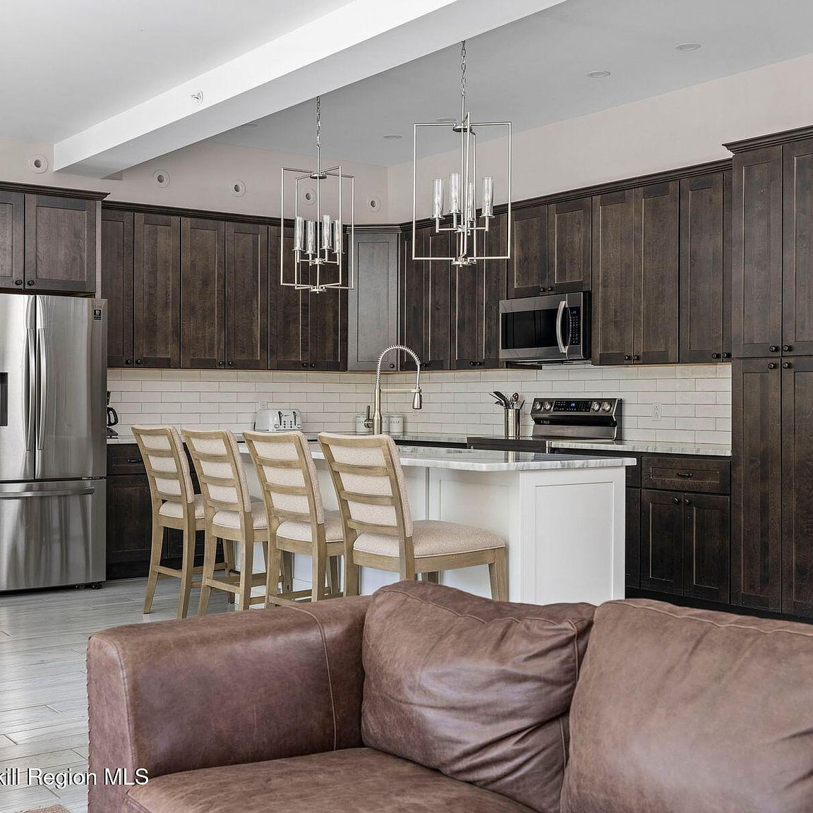The refined dining area anchors memorable moments with its expansive wooden table and cream-upholstered seating. Floor-to-ceiling windows frame spectacular Catskill vistas, bathing every meal in natural light. The modern chandelier creates intimate atmosphere for both casual family dinners and sophisticated entertaining, while light hardwood flooring adds warmth throughout this elegant space.